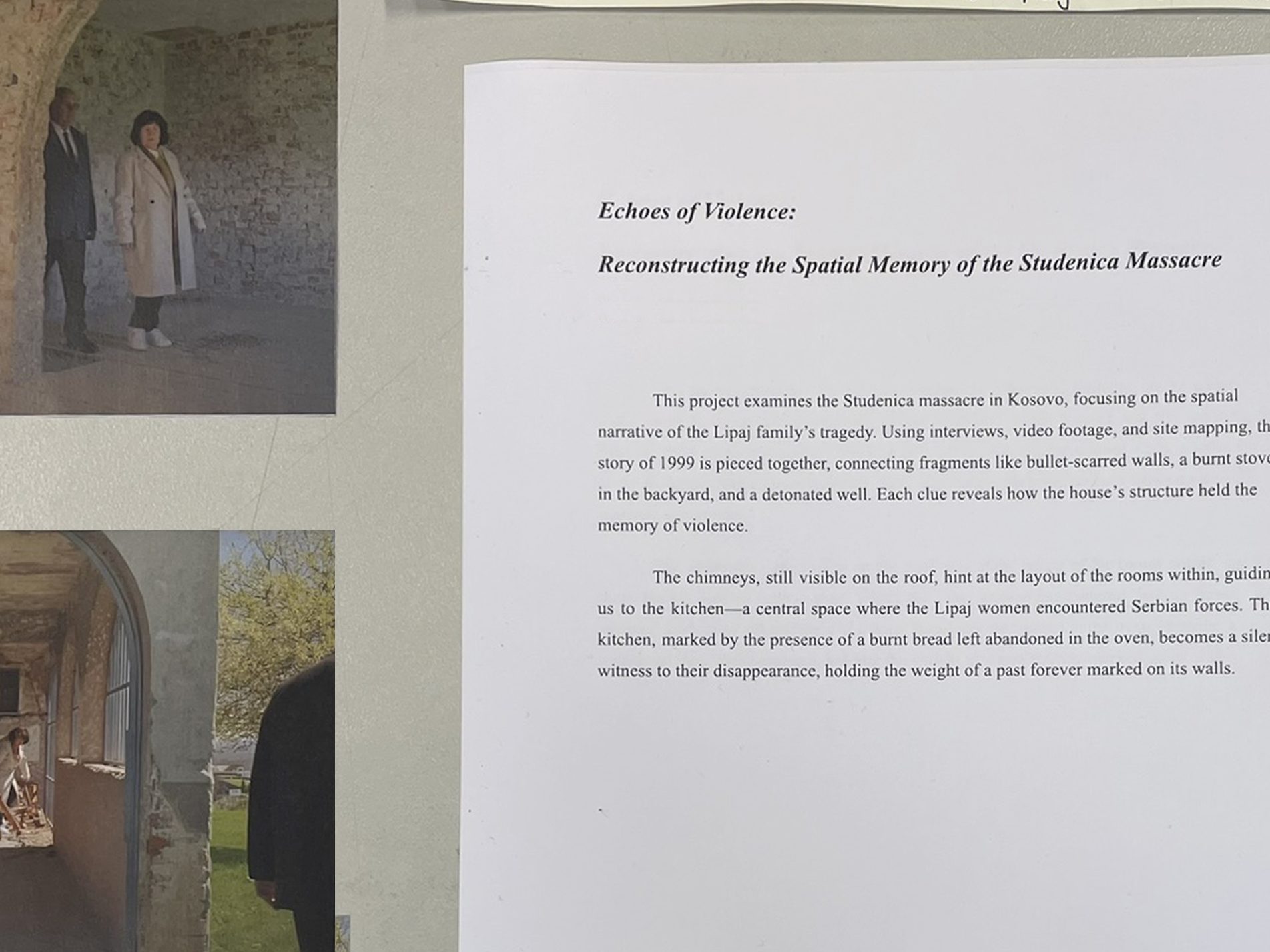 There is a unique ability in architecture, unseen in other disciplines, to overcome the limits of language in grasping the social. The production and use of architectural documents (maps, plans, sections, sketches or models) uncovers hidden layers of buildings and narratives. Focusing specifically on traumatic memories in Kosovo between 1980-1999, students of this elective will produce architectural documents with the aim of exploring the link between space and trauma. They will be given a collection of sources, ranging from newspaper articles and poems, to films and prison letters. Focusing on a selected narrative will allow the architecture student—equipped with the tools to comprehend the tactile and the visual—to explore the spatial implications of trauma.